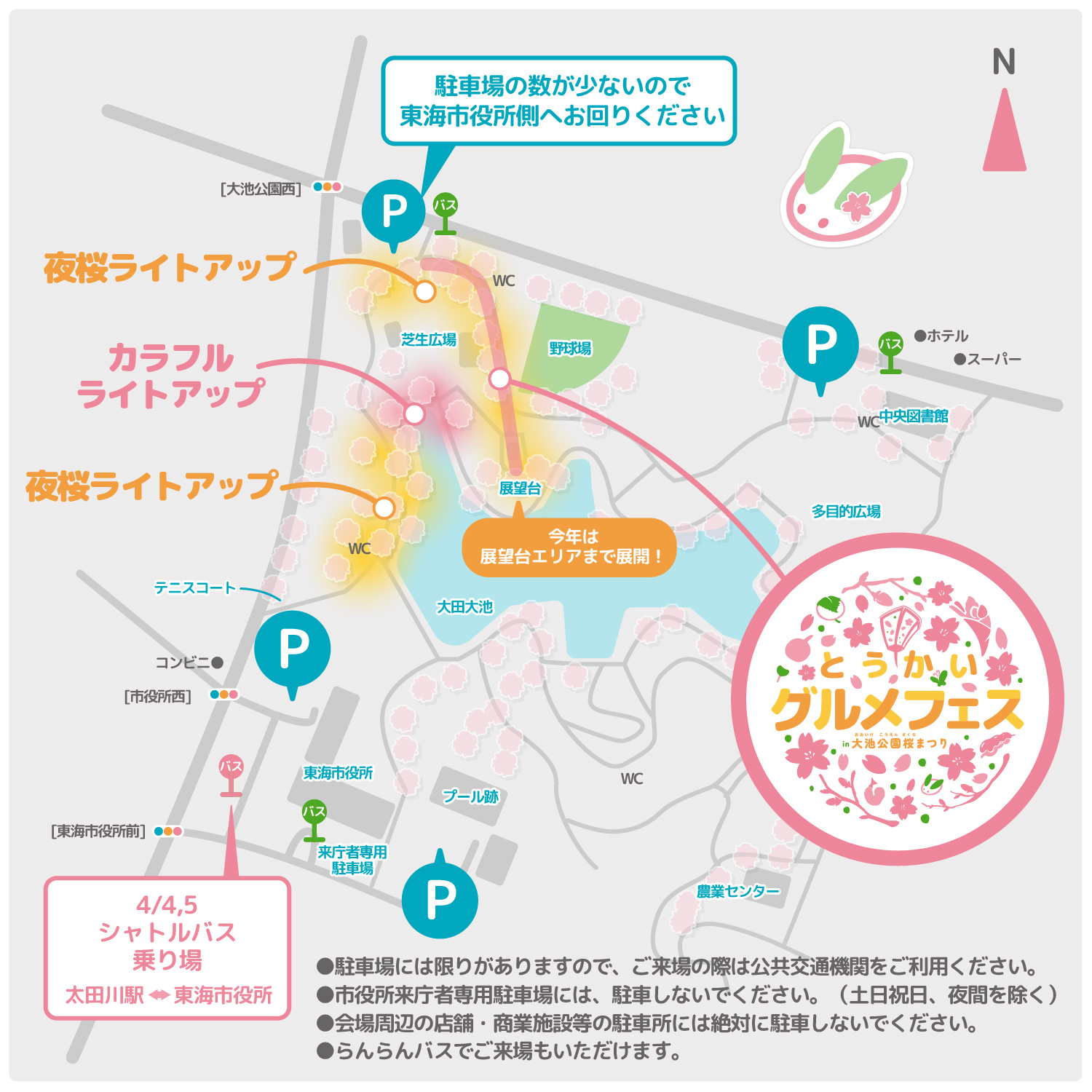今年は大人気のキッチンカーや自慢のお店がさらに充実!昼は咲き誇る桜の下で、夜は幻想的なライトアップとともに、1日中絶品グルメをご堪能いただけます。さらに今年は「展望台エリア」にお店を拡大!広々とした開放的なスペースで、桜の絶景を見下ろしながら心ゆくまで美味しいグルメをお楽しみください!